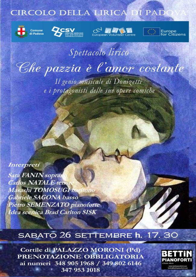 Che follia è l’amor costante! Sabato 26 settembre alle ore 17:30 Cortile di Palazzo Moroni – Padova Brillante concerto di apertura della XXXVII stagione del Circolo della Lirica di Padova con la nuova direzione artistica del maestro Nicola Simoni, direttore d’orchestra. Il genio musicale di Donizetti e i protagonisti delle sue opere comiche faranno da…
