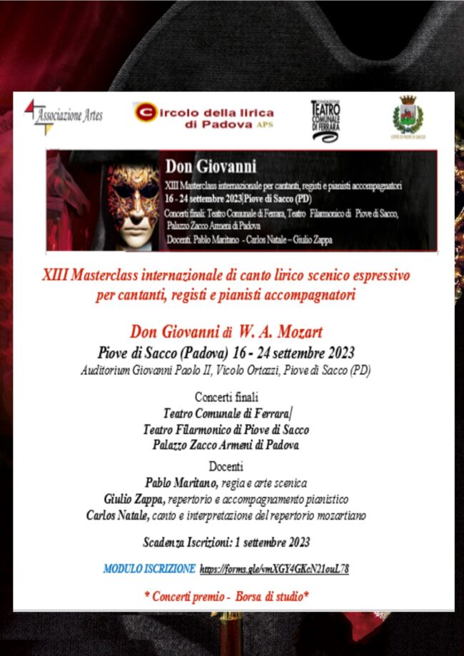 XIII Opera Workshop : Don Giovanni by Mozart For singers, accompanists and directors September 16-24, 2023 Piove di Sacco (Italy) Final performances at Teatro Comunale of Ferrara, Teatro Filarmonico of Piove di Sacco, Palazzo Zacco Armeni of Padova. The course activities include: singing techniques, stage techniques as well as study and…