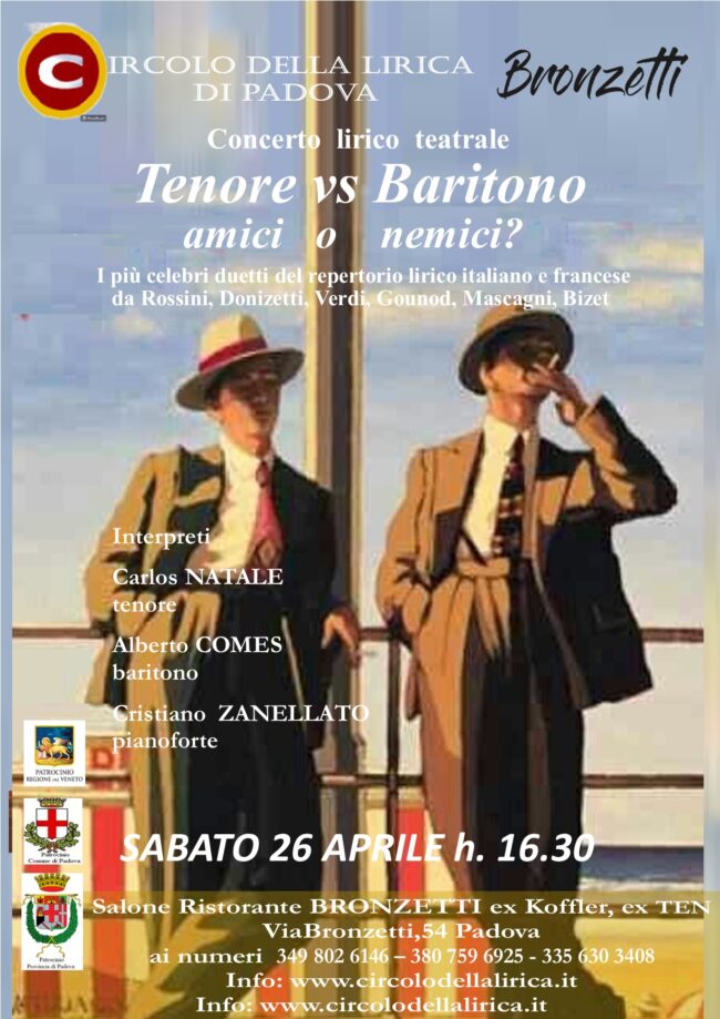 Tenore vs Baritono – amici o nemici?” Duelli vocali e grandi emozioni al Circolo della Lirica di Padova – Sabato 26 aprile alle ore 16.30, Salone Ristorante BRONZETTI Sabato 26 aprile alle ore 16.30, nella splendida cornice del Circolo Unificato dell’Esercito di Padova (Palazzo Zacco, Prato della Valle 82), il Circolo della Lirica di Padova…