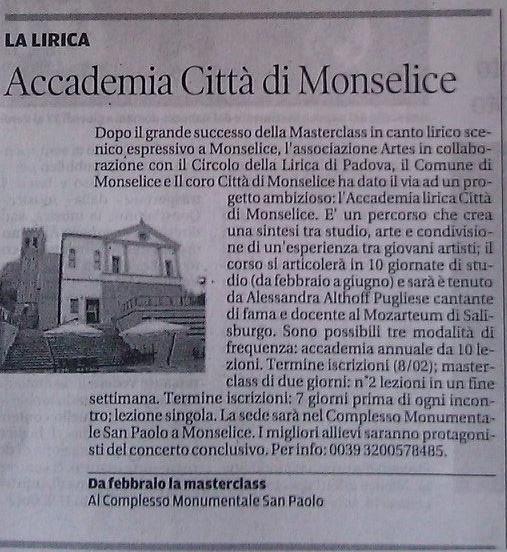 L’associazione Artes nasce in Toscana nel Febbraio del 2008 con l’intento di promuovere la cultura musicale in Italia attraverso l’organizzazione di concerti e di masterclass; nel 2012 viene fondata la delegazione “Artes Padova” diretta dal M°Nicola Simoni. “L’accademia di canto Città di Monselice” si configura come il proseguimento della masterclass di canto lirico scenico espressivo tenuta dai maestri S.Vizioli e A.Althoff che si è svolta a Monselice nel settembre 2012. Il progetto è promosso dal Comune di Monselice, dal Coro Città di Monselice e dal Circolo della Lirica di Padova (ente che dal 1983 promuove la passione per il canto lirico nella propria città e che vanta di una tradizione musicale rappresentata dal Teatro Verdi).