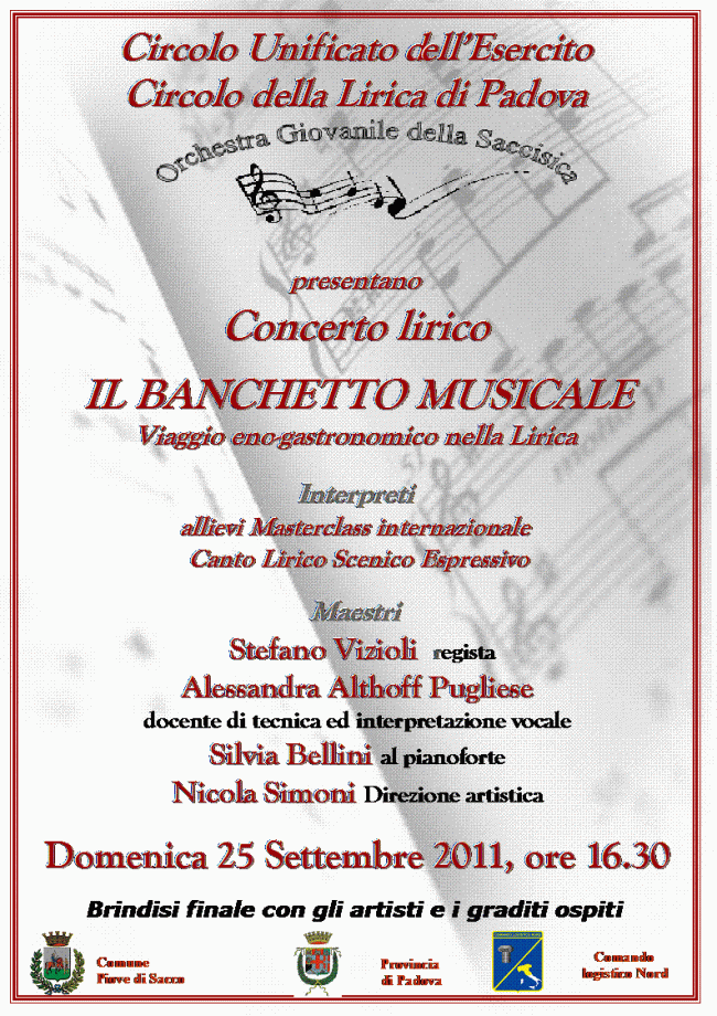 Domenica 11 dicembre, a Palazzo Zacco, sede del Circolo Unificato dell’Esercito, si è tenuto l’ultimo pomeriggio musicale del 2011 che è coinciso con il tradizionale “concerto degli auguri” di fine anno. L’occasione del gradito rendez-vous è stata propizia per festeggiare i 25 anni di carriera di un brillante Artista veneto al quale il Circolo della…