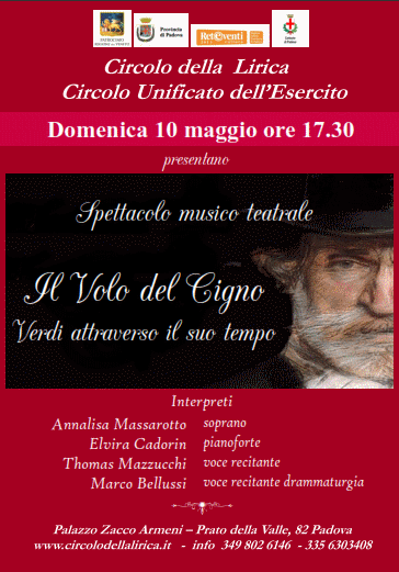 Nuovo appuntamento del Circolo della Lirica di Padova con gli appassionati per la rappresentazione Il Volo del Cigno, una pièce musico teatrale tra parola recitata e parola cantata, firmata dal regista veneziano Marco Bellussi, dedicata al grande compositore italiano Giuseppe Verdi soprannominato il cigno di Busseto.